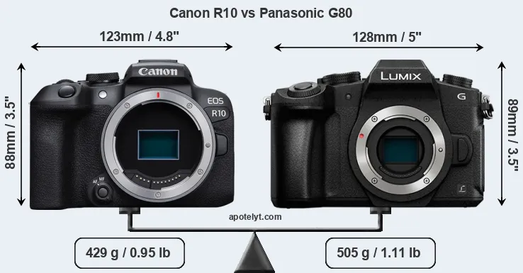 If the front view area (width x height) of the cameras is taken as an aggregate measure of their size, the Panasonic G80 is notably larger (5 percent) than the Canon R10. Moreover, the G80 is markedly heavier (18 percent) than the R10. It is noteworthy in this context that the G80 is splash and dust-proof, while the R10 does not feature any corresponding weather-sealing.
