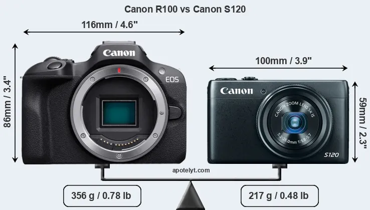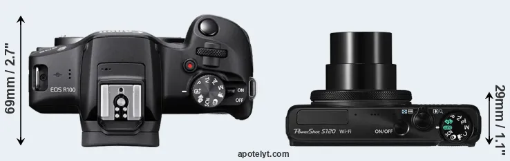 The side-by-side display below illustrates the physical size and weight of the Canon R100 and the Canon S120. The two cameras are presented according to their relative size. Three consecutive perspectives from the front, the top, and the back are available. All width, height and depth measures are rounded to the nearest millimeter.