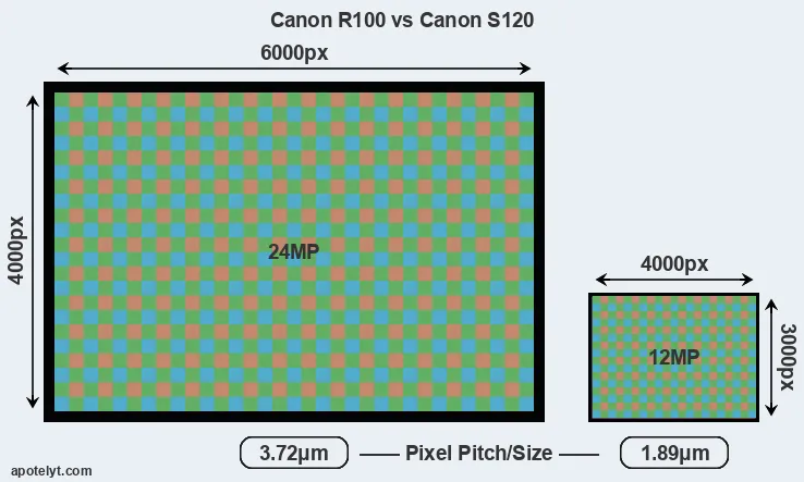 With 24MP, the R100 offers a higher resolution than the S120 (12MP), but the R100 nevertheless has larger individual pixels (pixel pitch of 3.72μm versus 1.89μm for the S120) due to its larger sensor. Moreover, the R100 is a much more recent model (by 9 years and 9 months) than the S120, and its sensor will have benefitted from technological advances during this time that further enhance the light gathering capacity of its pixels. Coming back to sensor resolution, it should be mentioned that the R100 has no anti-alias filter installed, so that it can capture all the detail its sensor resolves.