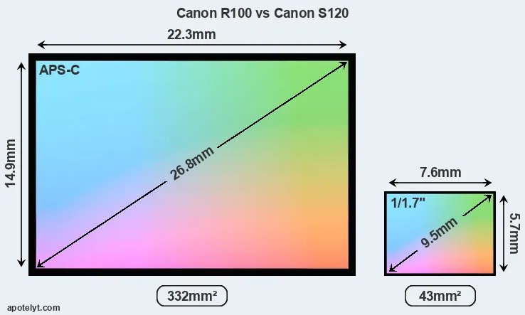 Of the two cameras under consideration, the Canon R100 features an APS-C sensor and the Canon S120 a 1/1.7-inch sensor. The sensor area in the S120 is 87 percent smaller. As a result of these sensor size differences, the cameras have a format factor of, respectively, 1.6 and 4.5. The sensor in the R100 has a native 3:2 aspect ratio, while the one in the S120 offers a 4:3 aspect.