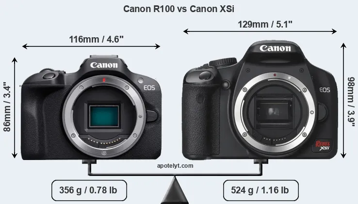 The physical size and weight of the Canon R100 and the Canon XSi are illustrated in the side-by-side display below. The two cameras are presented according to their relative size. Three consecutive views from the front, the top, and the rear side are shown. All width, height and depth dimensions are rounded to the nearest millimeter.