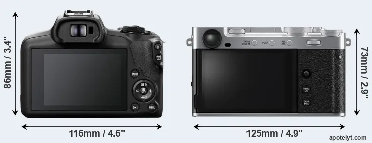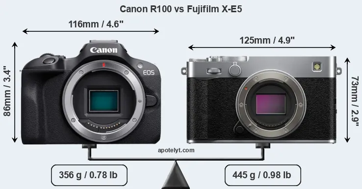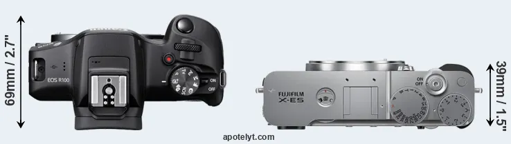 The side-by-side display below illustrates the physical size and weight of the Canon R100 and the Fujifilm X-E5. The two cameras are presented according to their relative size. Three consecutive views from the front, the top, and the rear side are shown. All width, height and depth dimensions are rounded to the nearest millimeter.