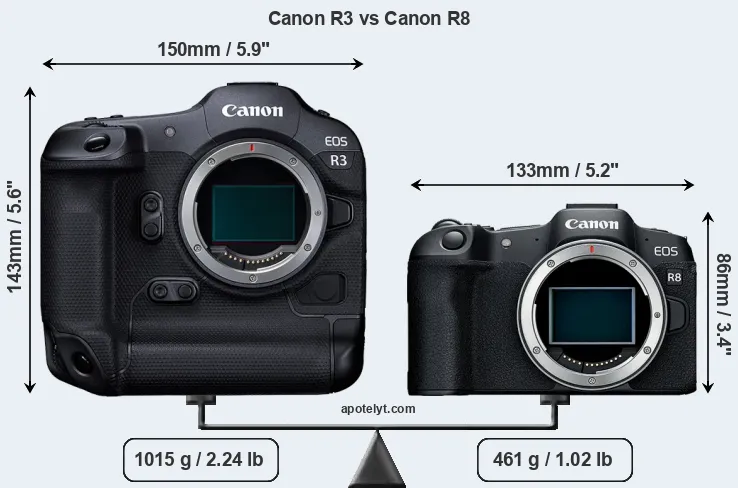 An illustration of the physical size and weight of the Canon R3 and the Canon R8 is provided in the side-by-side display below. The two cameras are presented according to their relative size. Three consecutive views from the front, the top, and the rear side are shown. All width, height and depth measures are rounded to the nearest millimeter.