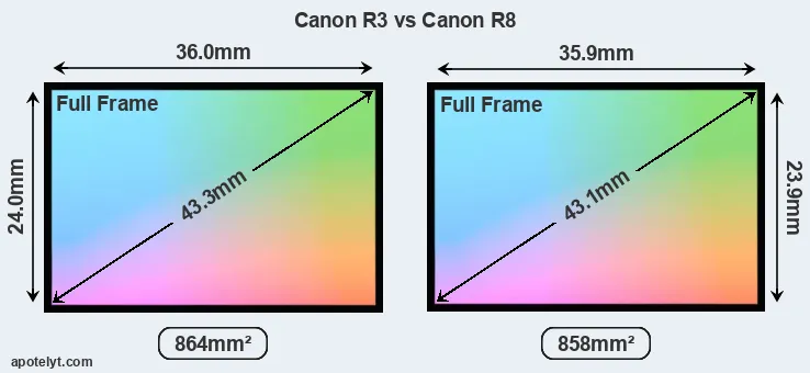 Both cameras under consideration feature a full frame sensor, but their sensors differ slightly in size. The sensor area in the R8 is 1 percent smaller. They nevertheless have the same format factor of 1.0. Both cameras have a native aspect ratio (sensor width to sensor height) of 3:2.