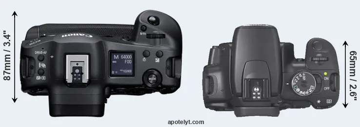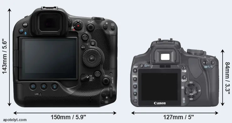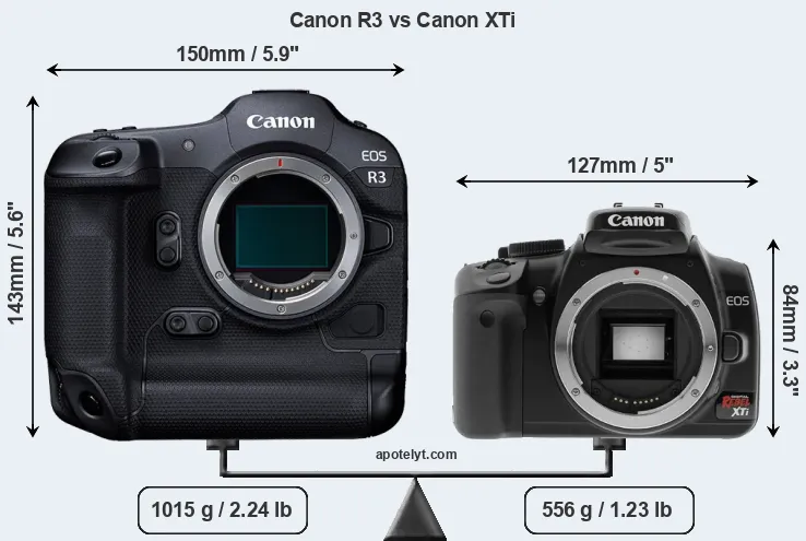 The side-by-side display below illustrates the physical size and weight of the Canon R3 and the Canon XTi. The two cameras are presented according to their relative size. Three consecutive perspectives from the front, the top, and the back are available. All width, height and depth dimensions are rounded to the nearest millimeter.