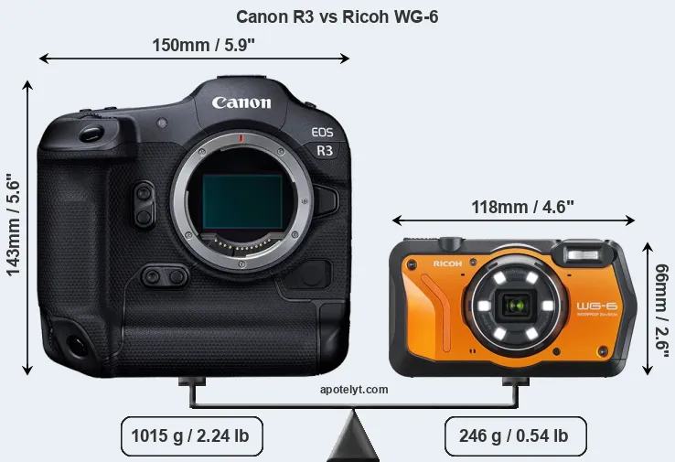 The side-by-side display below illustrates the physical size and weight of the Canon R3 and the Ricoh WG-6. The two cameras are presented according to their relative size. Three consecutive perspectives from the front, the top, and the back are available. All width, height and depth dimensions are rounded to the nearest millimeter.
