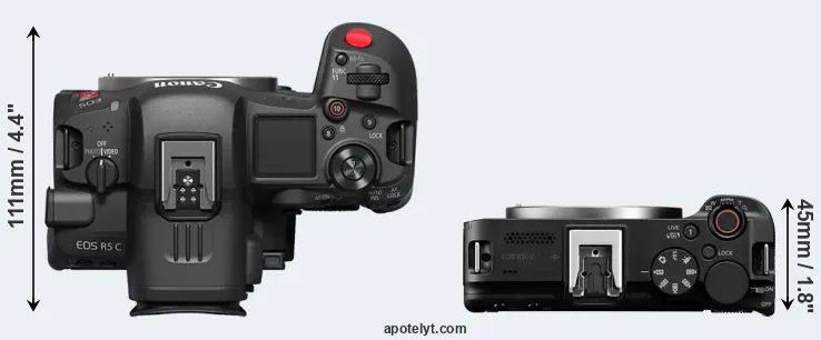An illustration of the physical size and weight of the Canon R5 C and the Canon R50 V is provided in the side-by-side display below. The two cameras are presented according to their relative size. Three consecutive views from the front, the top, and the rear side are shown. All width, height and depth measures are rounded to the nearest millimeter.
