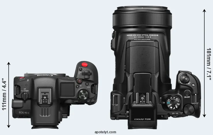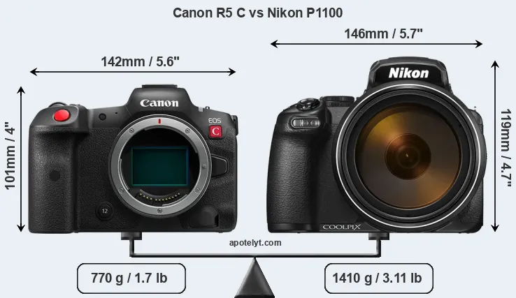 The physical size and weight of the Canon R5 C and the Nikon P1100 are illustrated in the side-by-side display below. The two cameras are presented according to their relative size. Three successive views from the front, the top, and the rear are shown. All width, height and depth measures are rounded to the nearest millimeter.