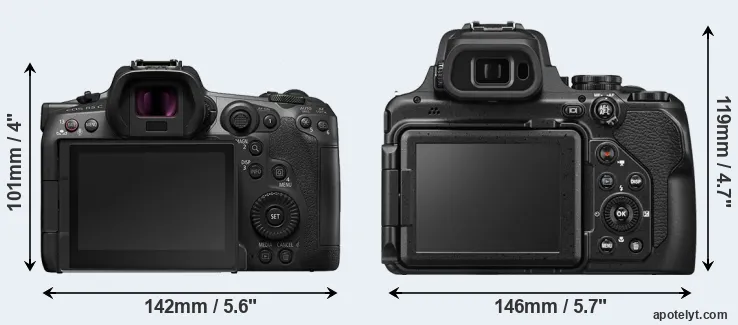 The above size and weight comparisons are to some extent incomplete and possibly misleading, as the P1100 has a lens built in, whereas the R5 C is an interchangeable lens camera that requires a separate lens. Attaching the latter will add extra weight and bulk to the setup.