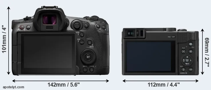 The above size and weight comparisons are to some extent incomplete and possibly misleading, as the TZ95 has a lens built in, whereas the R5 C is an interchangeable lens camera that requires a separate lens. Attaching the latter will add extra weight and bulk to the setup.