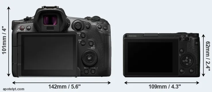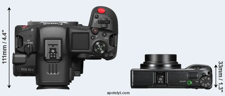 The above size and weight comparisons are to some extent incomplete and possibly misleading, as the GR III has a lens built in, whereas the R5 C is an interchangeable lens camera that requires a separate lens. Attaching the latter will add extra weight and bulk to the setup.