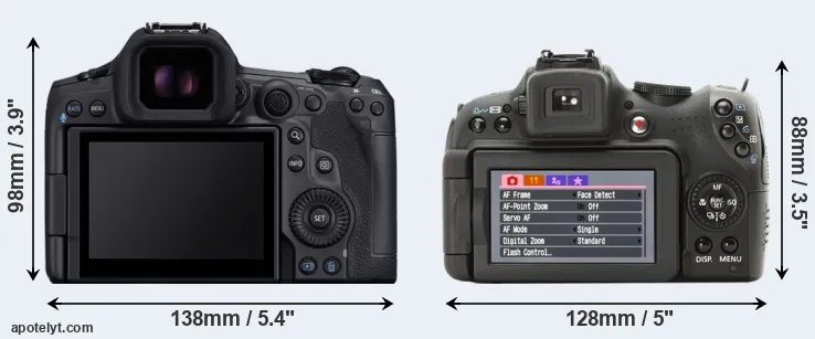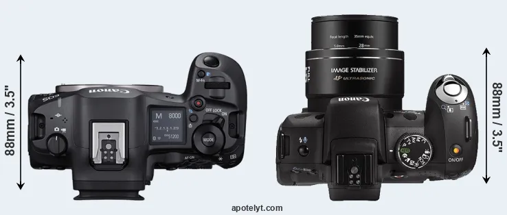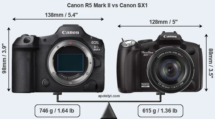 The side-by-side display below illustrates the physical size and weight of the Canon R5 Mark II and the Canon SX1. The two cameras are presented according to their relative size. Three consecutive views from the front, the top, and the rear side are shown. All width, height and depth measures are rounded to the nearest millimeter.