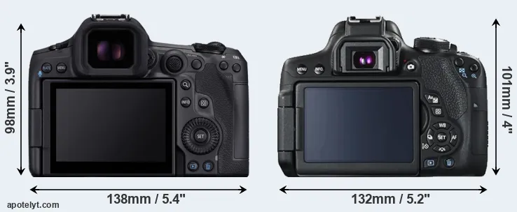 The Canon EOS R5 Mark II and the Canon EOS Rebel T6i (labelled Canon 750D in some countries) are two digital cameras that were revealed to the public, respectively, in July 2024 and February 2015. The R5 Mark II is a mirrorless interchangeable lens camera, while the T6i is a DSLR. The cameras are based on a full frame (R5 Mark II) and an APS-C (T6i) sensor. The R5 Mark II has a resolution of 44.8 megapixels, whereas the T6i provides 24 MP.