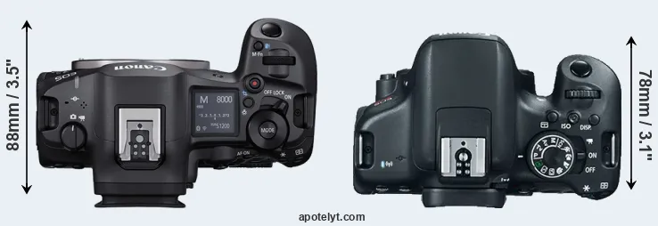 The side-by-side display below illustrates the physical size and weight of the Canon R5 Mark II and the Canon T6i. The two cameras are presented according to their relative size. Three successive views from the front, the top, and the rear are shown. All size dimensions are rounded to the nearest millimeter.