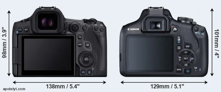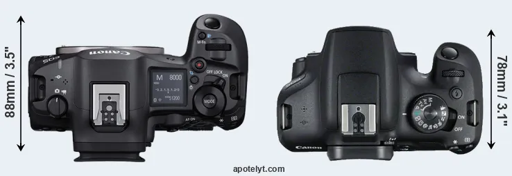 The side-by-side display below illustrates the physical size and weight of the Canon R5 Mark II and the Canon T7. The two cameras are presented according to their relative size. Three successive views from the front, the top, and the rear are shown. All size dimensions are rounded to the nearest millimeter.