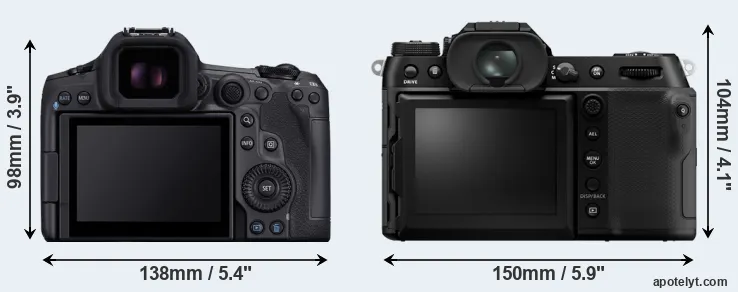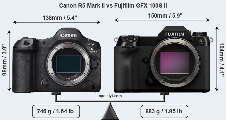 The side-by-side display below illustrates the physical size and weight of the Canon R5 Mark II and the Fujifilm GFX 100S II. The two cameras are presented according to their relative size. Three consecutive views from the front, the top, and the rear side are shown. All width, height and depth measures are rounded to the nearest millimeter.