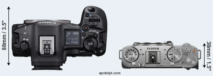 The side-by-side display below illustrates the physical size and weight of the Canon R5 Mark II and the Fujifilm X-M5. The two cameras are presented according to their relative size. Three consecutive perspectives from the front, the top, and the back are available. All width, height and depth measures are rounded to the nearest millimeter.