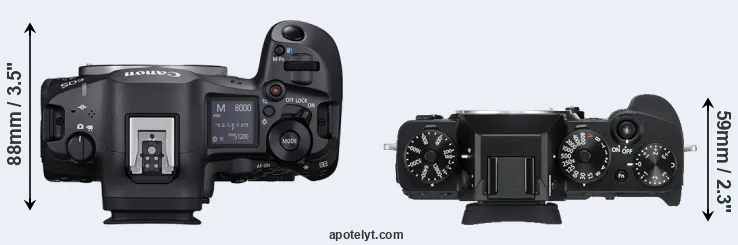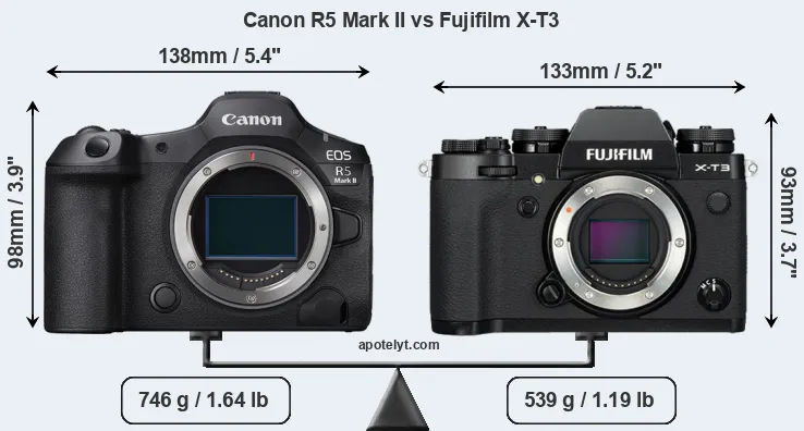 The side-by-side display below illustrates the physical size and weight of the Canon R5 Mark II and the Fujifilm X-T3. The two cameras are presented according to their relative size. Three successive views from the front, the top, and the rear are shown. All width, height and depth measures are rounded to the nearest millimeter.