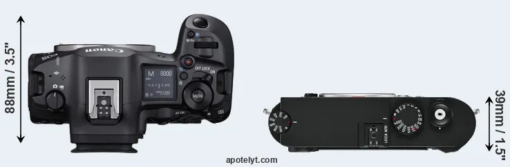 The side-by-side display below illustrates the physical size and weight of the Canon R5 Mark II and the Leica M10. The two cameras are presented according to their relative size. Three successive views from the front, the top, and the rear are shown. All size dimensions are rounded to the nearest millimeter.