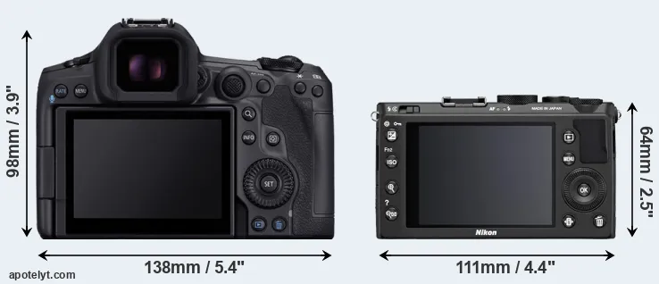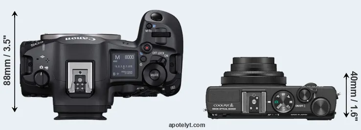 The above size and weight comparisons are to some extent incomplete and possibly misleading, as the Coolpix A has a lens built in, whereas the R5 Mark II is an interchangeable lens camera that requires a separate lens. Attaching the latter will add extra weight and bulk to the setup.