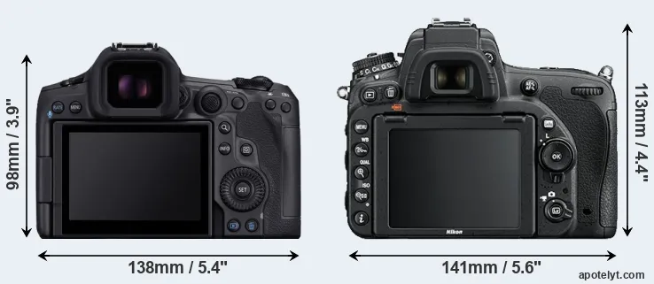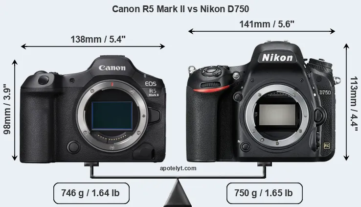 The side-by-side display below illustrates the physical size and weight of the Canon R5 Mark II and the Nikon D750. The two cameras are presented according to their relative size. Three successive views from the front, the top, and the rear are shown. All width, height and depth dimensions are rounded to the nearest millimeter.