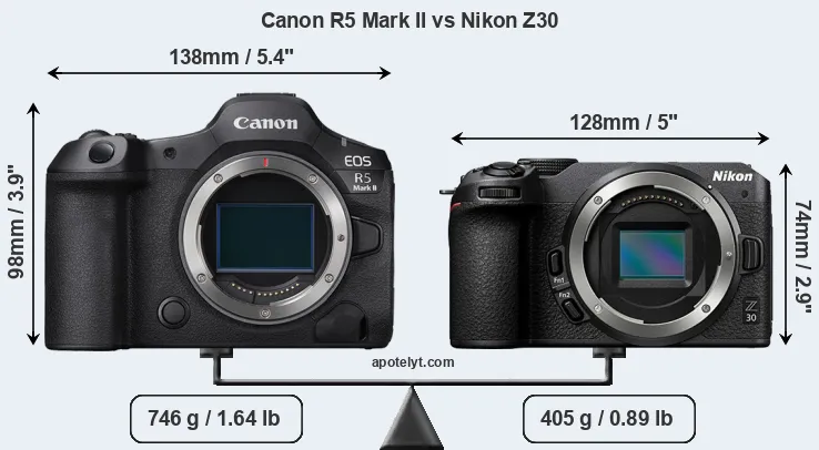 An illustration of the physical size and weight of the Canon R5 Mark II and the Nikon Z30 is provided in the side-by-side display below. The two cameras are presented according to their relative size. Three successive views from the front, the top, and the rear are shown. All size dimensions are rounded to the nearest millimeter.