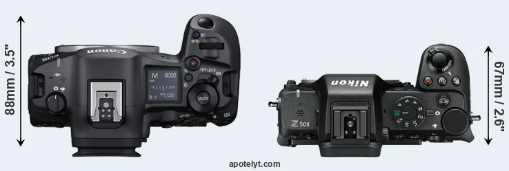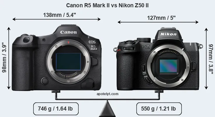 The side-by-side display below illustrates the physical size and weight of the Canon R5 Mark II and the Nikon Z50 II. The two cameras are presented according to their relative size. Three consecutive perspectives from the front, the top, and the back are available. All width, height and depth dimensions are rounded to the nearest millimeter.