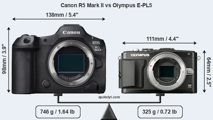 If the front view area (width x height) of the cameras is taken as an aggregate measure of their size, the Olympus E-PL5 is considerably smaller (47 percent) than the Canon R5 Mark II. Moreover, the E-PL5 is substantially lighter (56 percent) than the R5 Mark II. It is worth mentioning in this context that the R5 Mark II is splash and dust resistant, while the E-PL5 does not feature any corresponding weather-sealing.