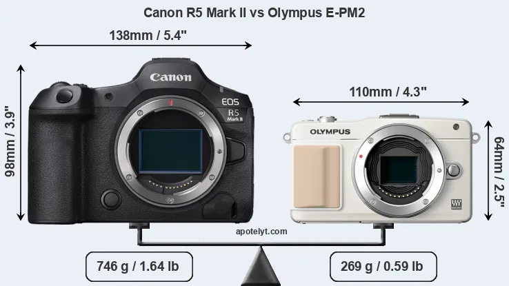 If the front view area (width x height) of the cameras is taken as an aggregate measure of their size, the Olympus E-PM2 is considerably smaller (48 percent) than the Canon R5 Mark II. Moreover, the E-PM2 is substantially lighter (64 percent) than the R5 Mark II. It is worth mentioning in this context that the R5 Mark II is splash and dust resistant, while the E-PM2 does not feature any corresponding weather-sealing.