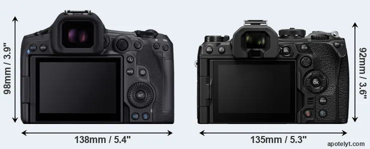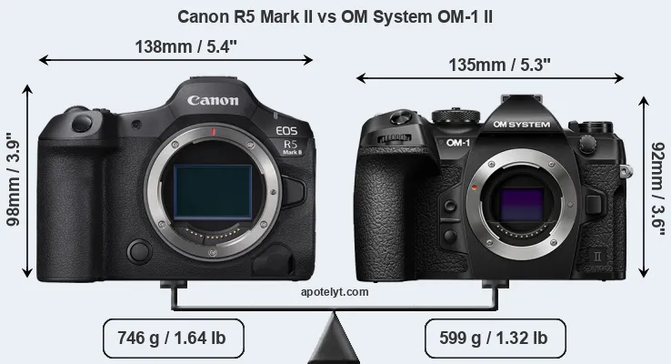 An illustration of the physical size and weight of the Canon R5 Mark II and the OM System OM-1 II is provided in the side-by-side display below. The two cameras are presented according to their relative size. Three successive views from the front, the top, and the rear are shown. All width, height and depth dimensions are rounded to the nearest millimeter.