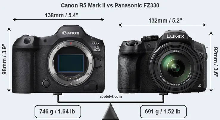 The physical size and weight of the Canon R5 Mark II and the Panasonic FZ330 are illustrated in the side-by-side display below. The two cameras are presented according to their relative size. Three successive views from the front, the top, and the rear are shown. All width, height and depth measures are rounded to the nearest millimeter.
