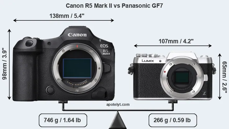 An illustration of the physical size and weight of the Canon R5 Mark II and the Panasonic GF7 is provided in the side-by-side display below. The two cameras are presented according to their relative size. Three consecutive views from the front, the top, and the rear side are shown. All width, height and depth measures are rounded to the nearest millimeter.