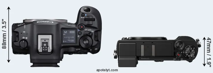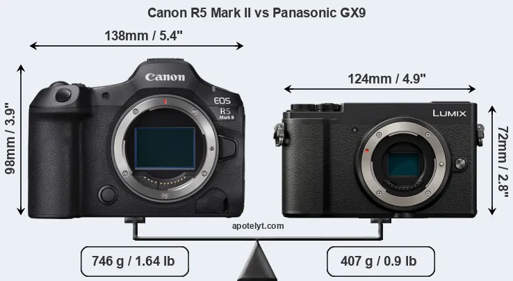 The physical size and weight of the Canon R5 Mark II and the Panasonic GX9 are illustrated in the side-by-side display below. The two cameras are presented according to their relative size. Three consecutive perspectives from the front, the top, and the back are available. All width, height and depth dimensions are rounded to the nearest millimeter.