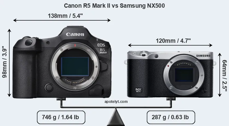 The side-by-side display below illustrates the physical size and weight of the Canon R5 Mark II and the Samsung NX500. The two cameras are presented according to their relative size. Three successive views from the front, the top, and the rear are shown. All width, height and depth dimensions are rounded to the nearest millimeter.