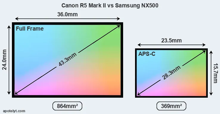 Of the two cameras under consideration, the Canon R5 Mark II features a full frame sensor and the Samsung NX500 an APS-C sensor. The sensor area in the NX500 is 57 percent smaller. As a result of these sensor size differences, the cameras have a format factor of, respectively, 1.0 and 1.5. Both cameras have a native aspect ratio (sensor width to sensor height) of 3:2.