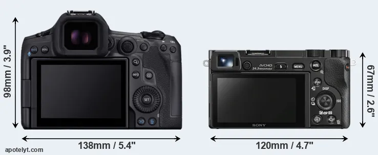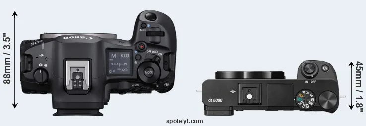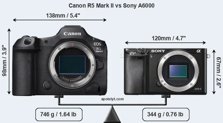 The side-by-side display below illustrates the physical size and weight of the Canon R5 Mark II and the Sony A6000. The two cameras are presented according to their relative size. Three consecutive perspectives from the front, the top, and the back are available. All width, height and depth dimensions are rounded to the nearest millimeter.