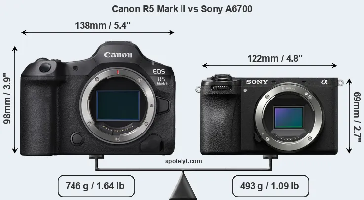 The physical size and weight of the Canon R5 Mark II and the Sony A6700 are illustrated in the side-by-side display below. The two cameras are presented according to their relative size. Three consecutive views from the front, the top, and the rear side are shown. All width, height and depth measures are rounded to the nearest millimeter.