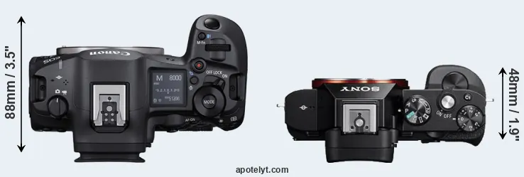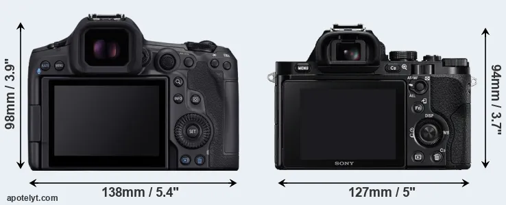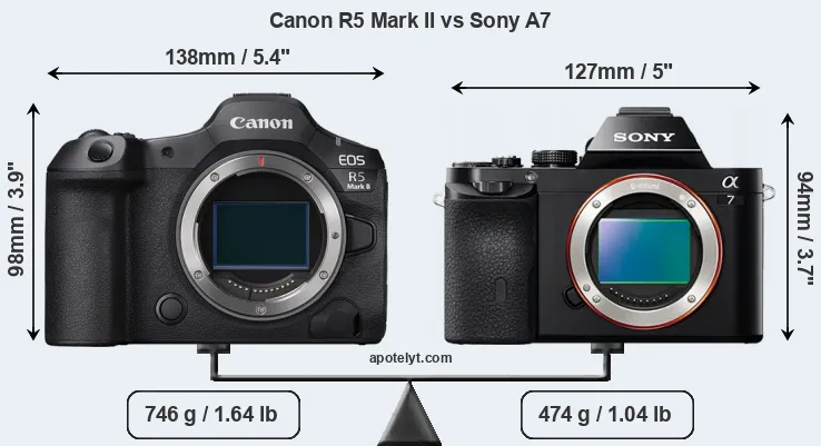The physical size and weight of the Canon R5 Mark II and the Sony A7 are illustrated in the side-by-side display below. The two cameras are presented according to their relative size. Three consecutive views from the front, the top, and the rear side are shown. All width, height and depth dimensions are rounded to the nearest millimeter.