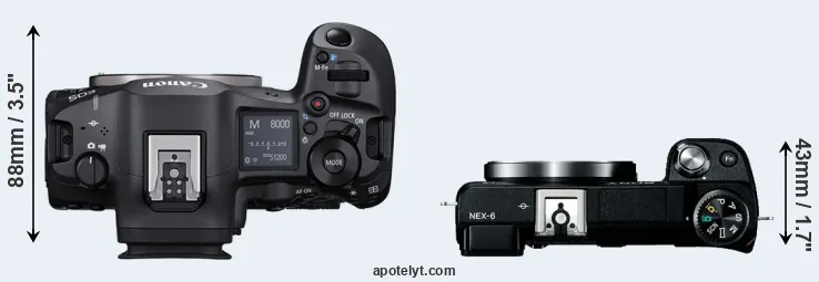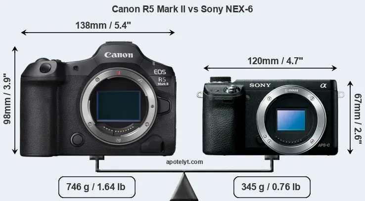 The physical size and weight of the Canon R5 Mark II and the Sony NEX-6 are illustrated in the side-by-side display below. The two cameras are presented according to their relative size. Three consecutive perspectives from the front, the top, and the back are available. All width, height and depth dimensions are rounded to the nearest millimeter.