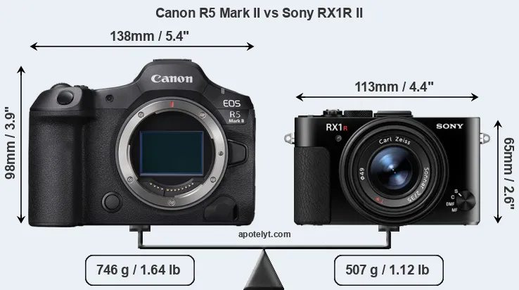 The side-by-side display below illustrates the physical size and weight of the Canon R5 Mark II and the Sony RX1R II. The two cameras are presented according to their relative size. Three consecutive views from the front, the top, and the rear side are shown. All width, height and depth measures are rounded to the nearest millimeter.