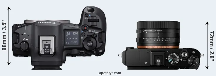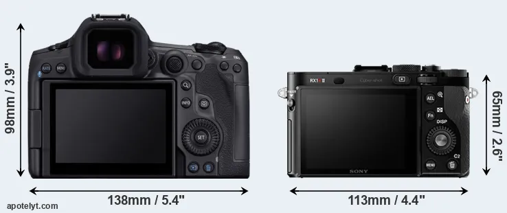 The above size and weight comparisons are to some extent incomplete and possibly misleading, as the RX1R II has a lens built in, whereas the R5 Mark II is an interchangeable lens camera that requires a separate lens. Attaching the latter will add extra weight and bulk to the setup.