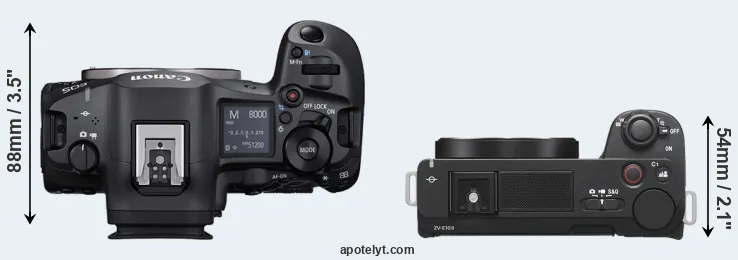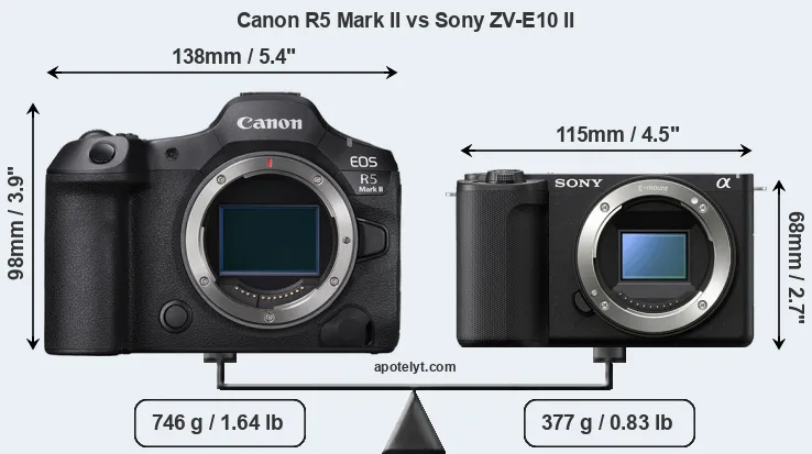 The physical size and weight of the Canon R5 Mark II and the Sony ZV-E10 II are illustrated in the side-by-side display below. The two cameras are presented according to their relative size. Three successive views from the front, the top, and the rear are shown. All size dimensions are rounded to the nearest millimeter.