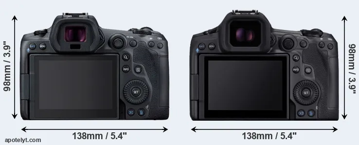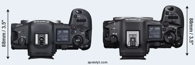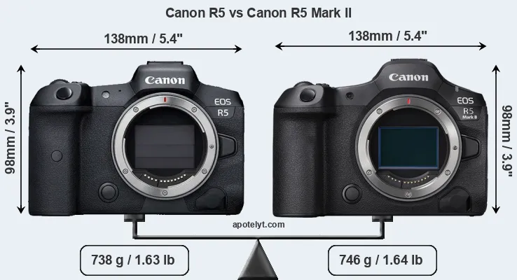 The side-by-side display below illustrates the physical size and weight of the Canon R5 and the Canon R5 Mark II. The two cameras are presented according to their relative size. Three consecutive perspectives from the front, the top, and the back are available. All width, height and depth measures are rounded to the nearest millimeter.