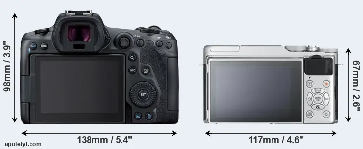 An illustration of the physical size and weight of the Canon R5 and the Fujifilm X-A10 is provided in the side-by-side display below. The two cameras are presented according to their relative size. Three successive views from the front, the top, and the rear are shown. All width, height and depth dimensions are rounded to the nearest millimeter.