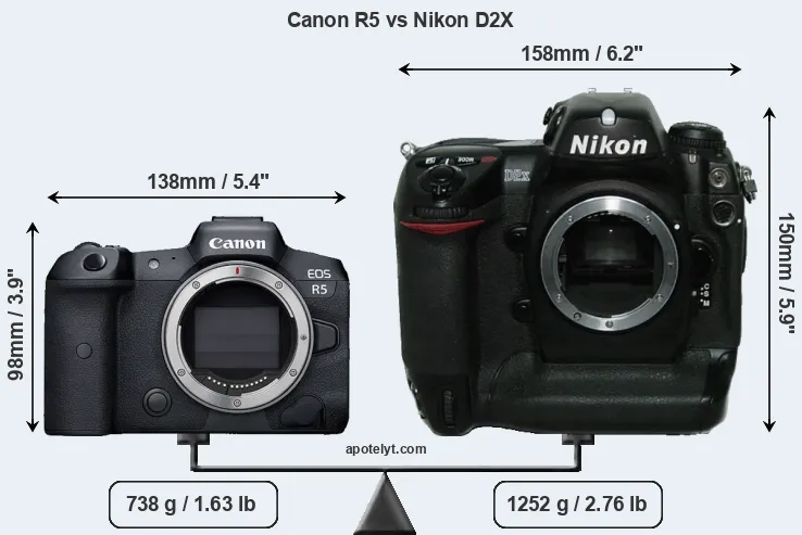 The side-by-side display below illustrates the physical size and weight of the Canon R5 and the Nikon D2X. The two cameras are presented according to their relative size. Three successive views from the front, the top, and the rear are shown. All width, height and depth dimensions are rounded to the nearest millimeter.