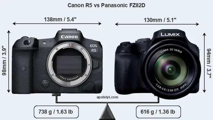 An illustration of the physical size and weight of the Canon R5 and the Panasonic FZ82D is provided in the side-by-side display below. The two cameras are presented according to their relative size. Three successive views from the front, the top, and the rear are shown. All size dimensions are rounded to the nearest millimeter.