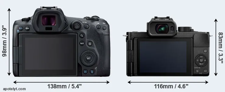 The side-by-side display below illustrates the physical size and weight of the Canon R5 and the Panasonic G100. The two cameras are presented according to their relative size. Three consecutive views from the front, the top, and the rear side are shown. All size dimensions are rounded to the nearest millimeter.