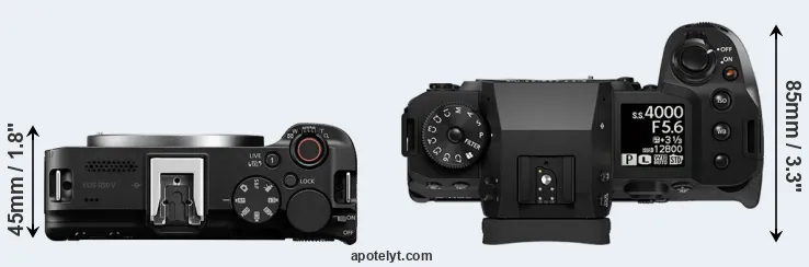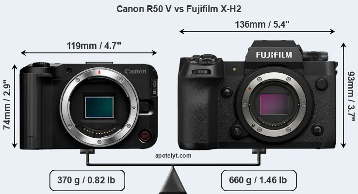 An illustration of the physical size and weight of the Canon R50 V and the Fujifilm X-H2 is provided in the side-by-side display below. The two cameras are presented according to their relative size. Three successive views from the front, the top, and the rear are shown. All size dimensions are rounded to the nearest millimeter.
