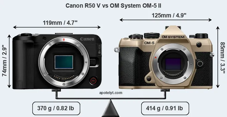 The Canon EOS R50 V and the OM System OM-5 II are two digital cameras that were revealed to the public, respectively, in March 2025 and June 2025. Both the R50 V and the OM-5 II are mirrorless interchangeable lens cameras that are based on an APS-C (R50 V) and a Four Thirds (OM-5 II) sensor. The Canon has a resolution of 24 megapixels, whereas the OM System provides 20.2 MP.