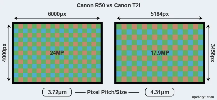 While the two cameras under review share the same sensor size, the R50 offers a higher resolution of 24 megapixels, compared with 17.9 MP of the T2i. This megapixels advantage translates into a 16 percent gain in linear resolution. On the other hand, these sensor specs imply that the R50 has a higher pixel density and a smaller size of the individual pixel (with a pixel pitch of 3.72μm versus 4.31μm for the T2i). In this context, it should be noted, however, that the R50 is much more recent (by 13 years) than the T2i, and its sensor will have benefitted from technological advances during this time that compensate for the smaller pixel size.